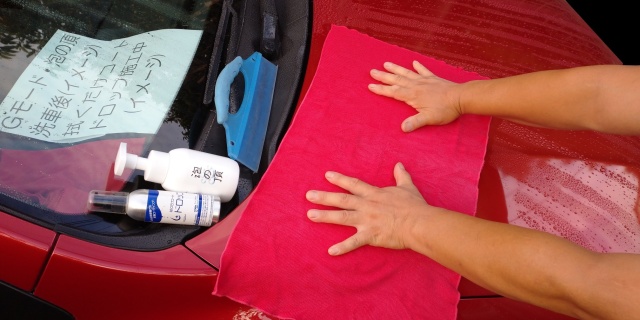 この為、今までのGモードから初めてGモード・泡の頂を使用する場合は今までのGモードの使用量ですと洗車後のすすぎに時間がかかる事がありますのでGモード・泡の頂を使用して洗車を行う場合は説明書の内容を正しく理解して少ない使用量で洗車を行って下さい。Gモード・泡の頂の使用量が説明書通りですと洗車後のすすぎは今まで通りに楽に行えます。洗車後の車体の水滴の拭き取りを水切りワイパーを使用して行いコートドロップ施工を赤いプロ仕様高級クロス・スムースを使用して行いました。画像写真のボンネットは、Gモード・泡の頂で洗車後その後のコートドロップ施工後の撥水状態の説明の為ボンネットは濡れた状態で画像写真撮影を行いました。