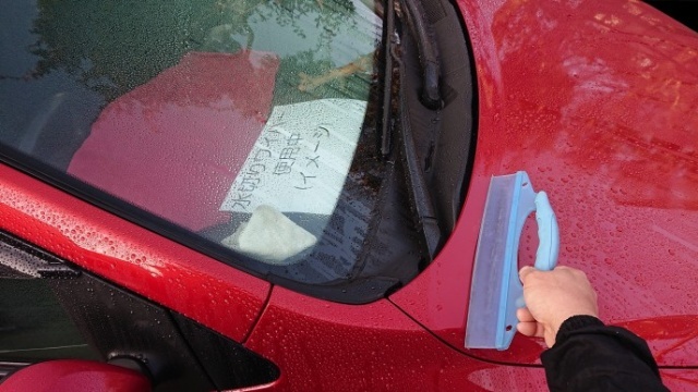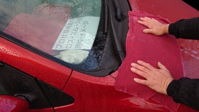 その後、車体の水滴の拭き取りに水切りワイパーとプロ仕様高級クロス・スムースを使用致しました。ガラス面の鎧(ガラス撥水剤)コーティング施工前及び水が弾かない状態で使う事はありませんがカーワックス、各種コーティング施工を行うとガラス面の油膜による視界不良、水垢又はウロコ状のシミになるのとクエスト使用時にマスキングを行ってもガラス面にコンパウンド等が付着すると汚れ落としに時間が掛かる場合がありますので、注意喚起の為、記載致しますが(鎧・ガラス撥水剤施工済の場合省略可)上記の理由で、最初に洗車を行う場合ガラス面のコーティング施工は、過去の感想掲載ページを参照。