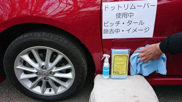 この時、車体(塗装面)にピッチ・タールが付着している場合、又は初めて4Cダイヤモンドコーティング施工又はFACE施工を行う場合は、洗車後、車体の水滴の拭き取りに水切りワイパーとプロ仕様高級クロス・スムースを使用して拭き取り後、鉄分除去前に、ドット・リムーバーを使用して付着した汚れを落として下さい。