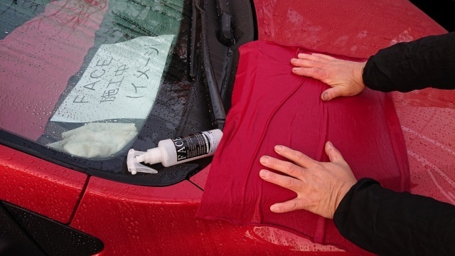 FACE施工後の水滴の拭き取りには、赤の極細繊維クロスを使用致しました。所要時間は、前途の4Cダイヤモンドコーティング施工まで行ってからこの表記のFACE施工のみで、洗車時間の小計は、全て、カローラ等クラスで、鉄粉除去作業の感想掲載ページの洗車開始から4Cダイヤモンドコーティング施工の感想掲載ページの4Cダイヤモンドコーティング施工後までの洗車時間は約20分から約2時間30分までの途中中断の時間を除いてからの小計は約5時間50分位かかりました。この表記のFACE施工を行うと、約6時間20分位かかりました。今回のFACE施工と後日Gモードessence(エッセンス)手洗い洗車を行います。