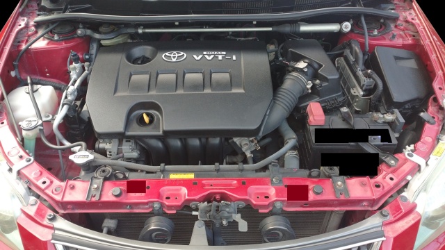 (赤)この車のエンジンは、横置き直列4気筒、約1800cc、FF、前方にエンジンを配置して前輪を駆動、洗車時に、コートドロップ施工を行いました。アルミホイールの洗浄をGモードエッセンスと、市販品のホイール洗浄用ブラシを使用して、洗浄作業を行ったらブレーキダスト等の汚れが落ちました。タイヤは、イオンシャンプーを使用して洗浄作業を行いました。