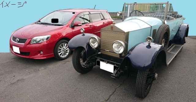 友人の車(昭和3年(1928年)式・製造国はイギリス・英国・製・Rolls-Royce Twenty。ロールス-ロイス トゥエンティ。オープンカー・水色・紺色)令和8年(2026年)現在で、約98年前の車です。この車は、日常使い、通勤に、使用しています。(幌の装着時の画像写真はありませんが、雨天時他等は、トノカバー・ソフトトップの幌を、装着致します)(赤い車は自分の車です。赤い車は画像写真撮影前にGモード洗車を行いました)(イメージの画像写真参照)