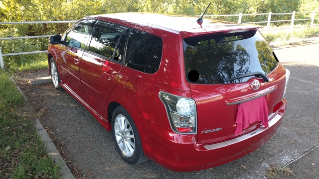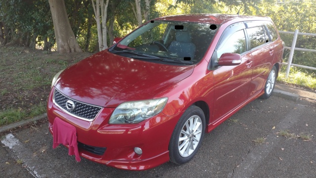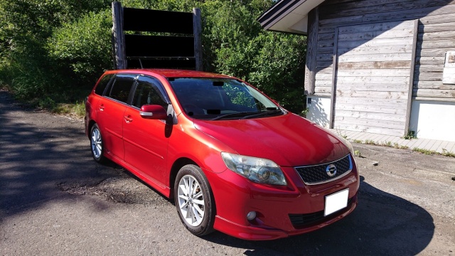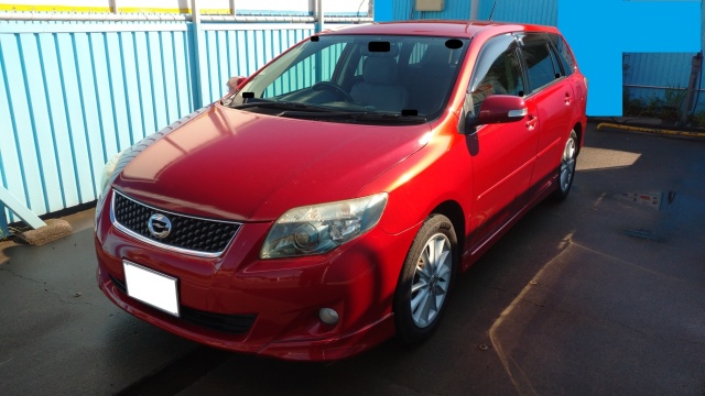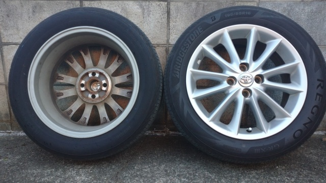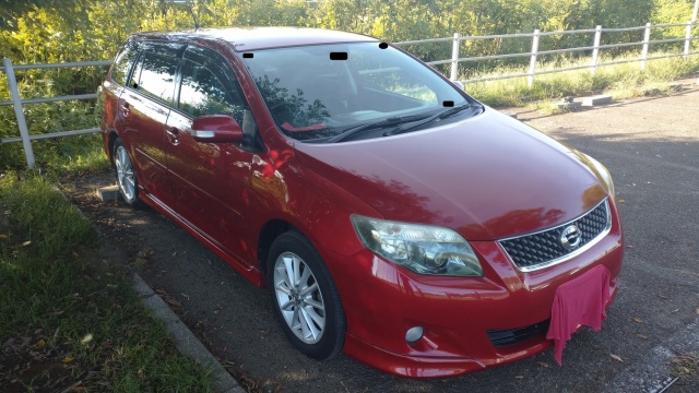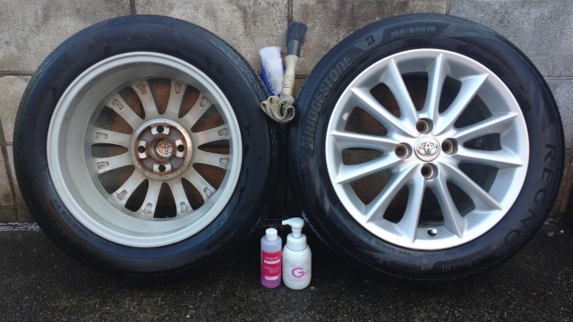 (赤)この車のエンジンは、横置き直列4気筒、約1800cc、FF、前方にエンジンを配置して前輪を駆動、洗車時に、コートドロップ施工を行いました。アルミホイールの洗浄をGモードエッセンスと、市販品のホイール洗浄用ブラシを使用して、洗浄作業を行ったらブレーキダスト等の汚れが落ちました。タイヤは、イオンシャンプーを使用して洗浄作業を行いました。